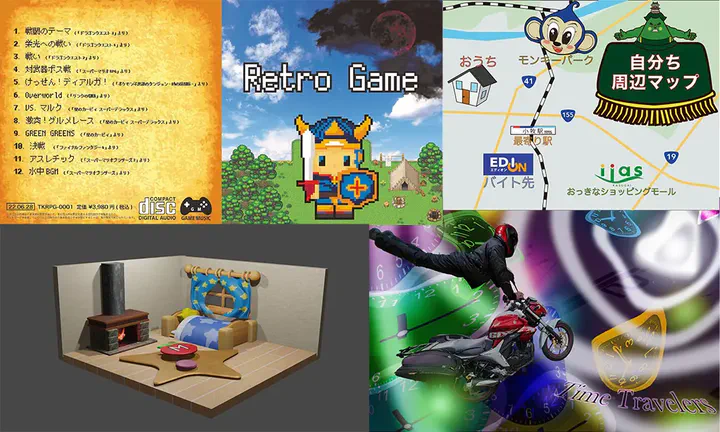 一昔前のドラゴンクエストや星のカービィなどのレトロゲームのBGMを集めたCDジャケットをオリジナルで製作した作品。レトロ感を出すためにドットの絵柄やフォントを使用した。右上に黒い雲と赤い月を配置することで不穏な雰囲気を出しストーリー性を出した。